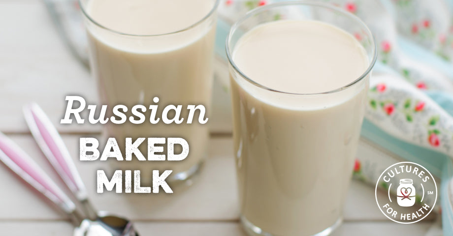 Russian baked milk, known as ryazhenka, somewhat resembles sweetened condensed milk. The initial slow heat gives the milk a dense, caramelized quality, and a rich creamy color. The caramelized milk is then cultured with buttermilk. Because it is fermented, it can be safely stored at room temperature for up to 40 hours.