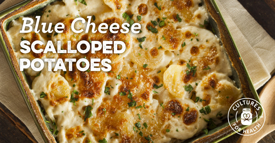 - Layer slices in the baking pan, placing blue cheese in between the layers. Pour cream over potatoes and cover with aluminum foil.