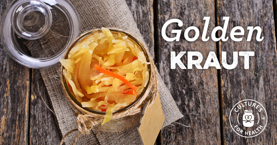 Garlic, ginger, and turmeric are used in many health tonics. This recipe combines them with the wonderful properties of sauerkraut. For an extra dose of goodness, cover this kraut with extra brine that you can drink all on its own for a shot of probiotics, enzymes, and all the wonderful properties of the spices involved.