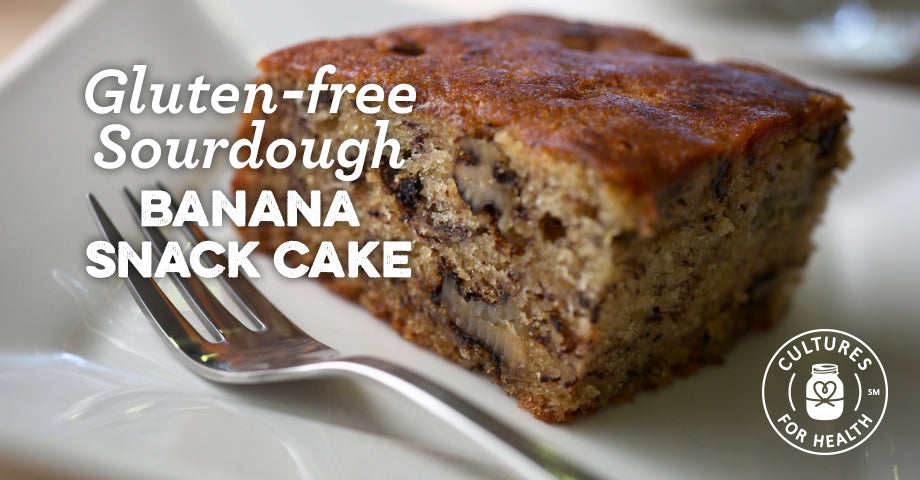 With plenty of banana flavor and just a hint of sweetness from fruit and honey, this gluten-free cake is great snack for any time of day. Fermented overnight, the dough can then be mixed with the remaining ingredients and baked early in the morning for a warm, fresh-from-the-oven breakfast.