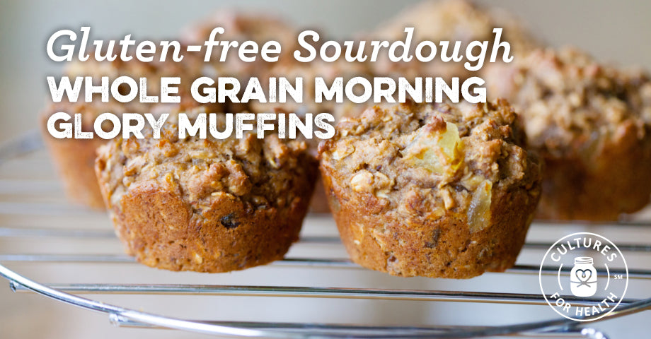 This recipe is as wholesome as a muffin gets. Soured whole grain flours come together with carrots, nuts, raisins, and orange to create a delicious and hearty breakfast muffin.