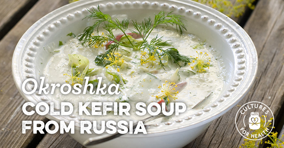 Okroshka is often made with rye kvass, a grain-based fermented beverage popular in Russia. This version, however, uses milk kefir. It's less common, but still traditional. Serve this cold soup on a hot day for a light and cooling meal that is full of nourishment.