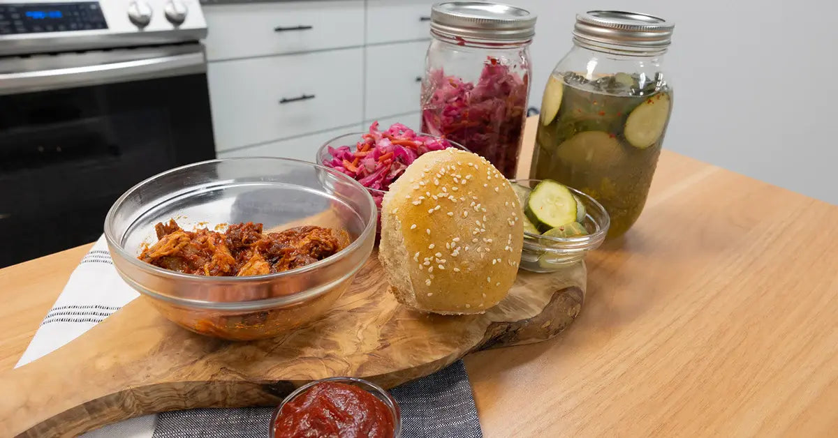 - Now we begin to plate! First, slice your whole wheat sourdough bun in half and add your fermented BBQ pulled pork. Next, add your curtido and Lacto-fermented pickles. Top it with the bun and you are ready to eat!